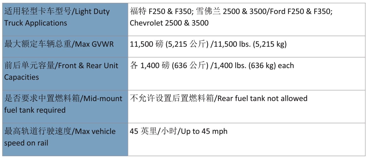 哈斯科鐵路公司生産的0307A輕型公鐵兩用車适用於(yú)滿足哈斯科鐵路公司推薦規格的輕型卡車及 SUV,使其能夠應用於(yú)鐵路,既能在公路上行駛也能在鐵路上行駛。0307A輕型公鐵兩用車設計堅 固緊奏可提供軌道作業所需的持久性。它採用瞭(le)橡膠懸挂、鋼軌電子絕緣和機械式安全銷。